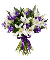 Необычное сочетание цветов в этом букете делает его очень оригинальным и уникальным. Насыщенно-фиолетовые ирисы, олицетворяющие на языке цветов отвагу и мужество, в сочетании с ярко-желтыми солидаго, создают невероятную контрастную композицию, а дополнительное украшение из зелени салала делает ее еще более насыщенной. Этот поистине джентельментский букет станет универсальным подарком на любой праздник или просто в обыденный день, а также поможет получателю забыть все обиды.
