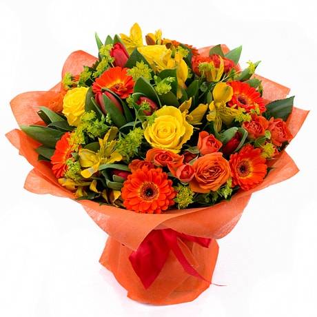 Эта композиция наполнена цветами разных оттенков и создает непередаваемой красоты букет. Тут и гермини (маленькие герберы), и одноголовые розы, кустовые розы, тюльпаны и альстромерии. Такое сочетание ненавязчиво, выражает преданность, теплые чувства, надежность, свет и улыбку. Прекрасно подойдет для повышения настроения друзьям или коллегам.